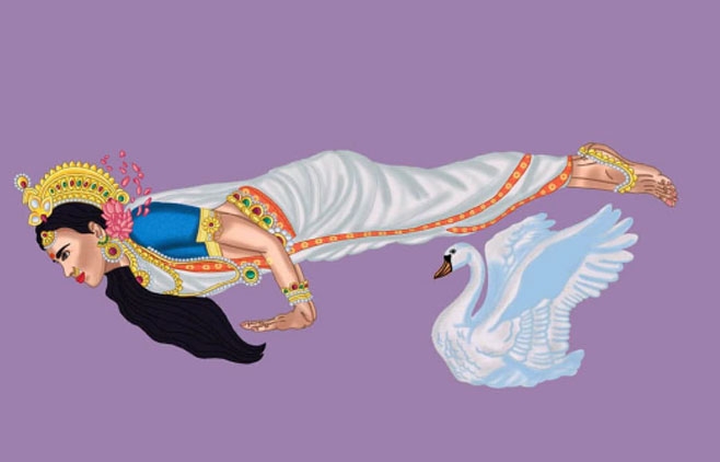 Ea era strălucitoare, maiestuoasă, albă ca laptele și strălucea ca o mie de sori. „Mare zeiță!”, a exclamat Brahmā. „Cine ești tu și cum te-ai manifestat în fața mea? Nici măcar nu am creat nimic încă! Tot ce am făcut a fost să exprim OṂ!” „Doamne Brahmā, eu sunt Sarasvatī, inspirația divină. Te-ai rugat pentru inspirație și ai primit-o. Exist dincolo de spațiu și timp, necreată și nedistrusă de ciclurile creației, conservării și distrugerii. Eu sunt zgomotul alb divin, cosmic al universului. M-am manifestat în fața ta prin virtutea rostirii tale divine, a cărei întruchipare sunt. Eu sunt sunetul sacru cu care vei crea toate lucrurile.”