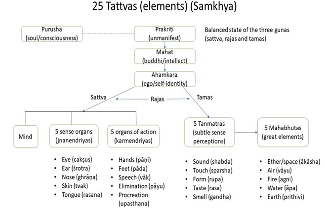 Filosofia Samkhya, a cărei denumire semnifică o enumerare, întrucât enumeră principiile realității, mijloacele de cunoaștere și modalitatea de a obține moksha, postulează 25 de tattvas: 23 de elemente sau cărămizi ale realității reprezintă ceea ce este manifestat (Prakriti), 1 tattva reprezintă ceea ce este nemanifestat (Mula Prakriti), iar a 25-a tattva o reprezintă Purusha, cunoscătorul.